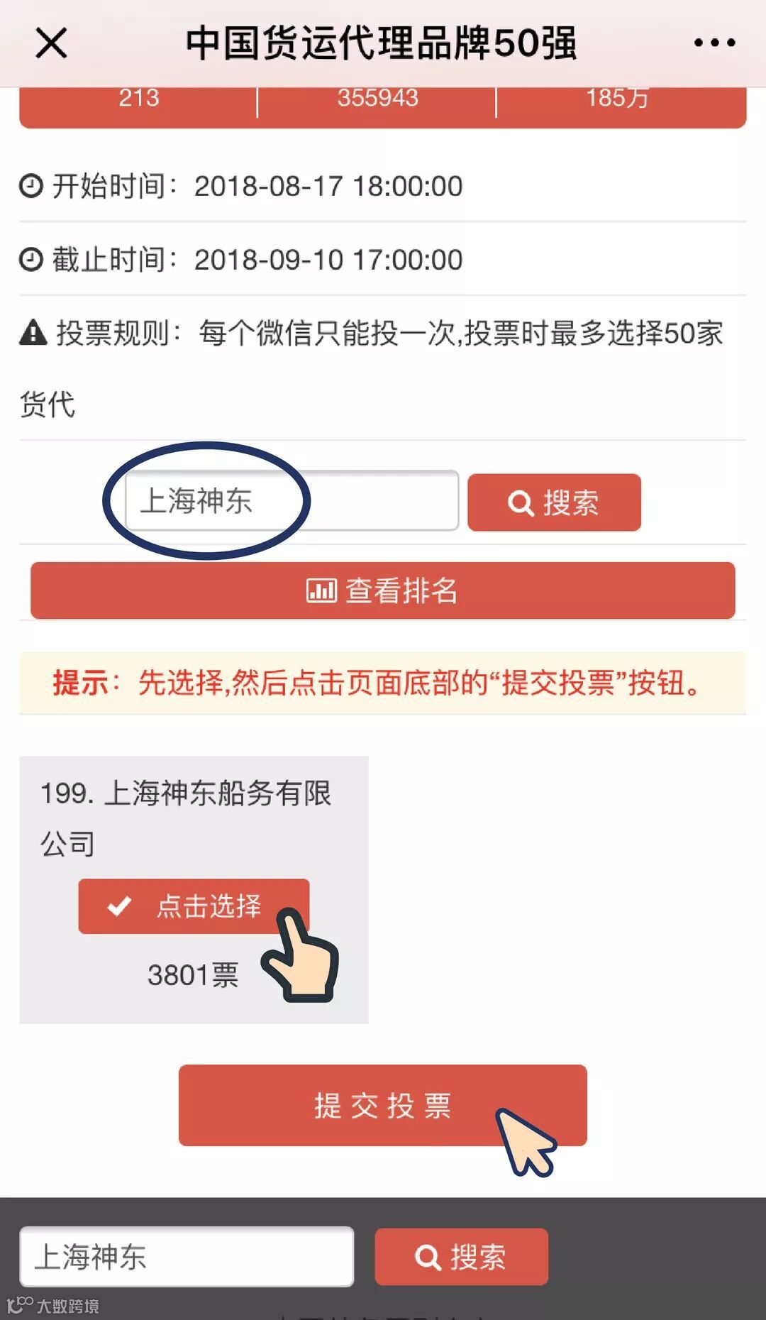 最后点击选择“上海神东船务有限公司”,再点击提交投票按钮,投出您尊贵的一票。