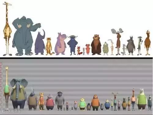 以往的动画片中为了视觉效果,动物的大小均有所调整,但是《疯狂动物城》中的动物全部按照原比例呈现。