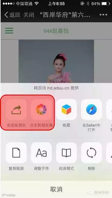 第八步,在此页面下发送给好友,或分享至朋友圈,邀请好友为选手投票,好友点开即为选手页面。