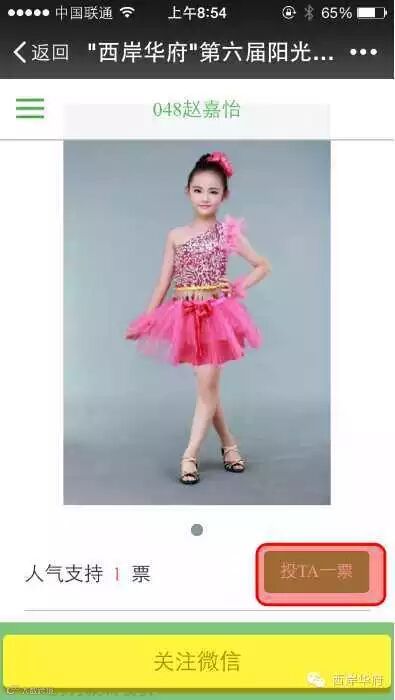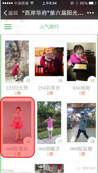 “西岸华府”第六届阳光少年才艺大赛网络人气王评选投票今日(12月21日)开启,投票时间截止至12月31日23:59,参加报名的选手家长赶快行动起来吧!下面跟小编一起来看一下如何进行投票操作:
