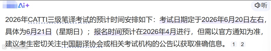原先每年考两次,上半年5月份一次,下半年11月一次。2023年开始,把CATTI一级,二级和三级口笔译改为一年一次下半年11月份考。今年2025年又从下半年的11月份改为上半年6月份,明年2026年到底是上半年6月份考还是下半年11月份考呢?虽然AI和其他博主给出的答案是上半年6月份考试4月份报名,但是我们还是得以官方信息为准。上班6月份最好了,下半年考试容易跟其他考试发生冲突。