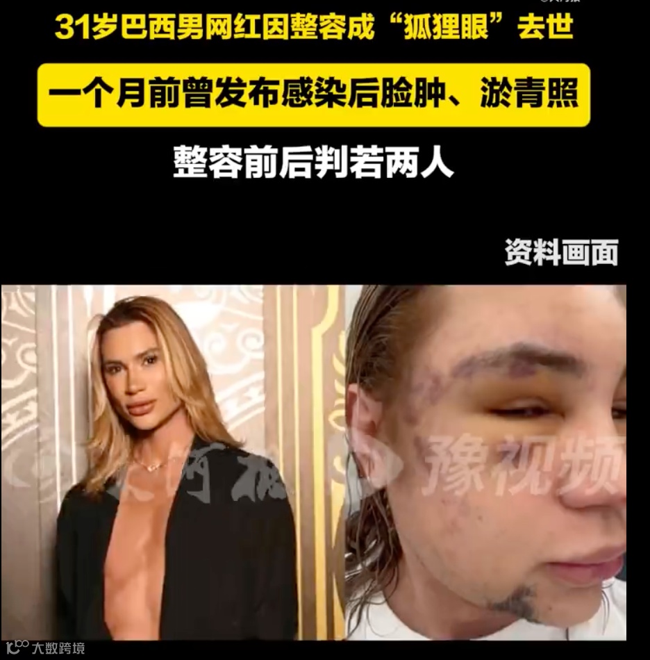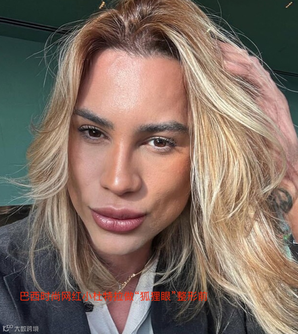 今年9月,巴西时尚网红小杜特拉接受流行于年轻群体的“狐狸眼”手术(眼角上提术)。此前已有网红术后出现额头长“犄角”等后遗症,但他仍选择在私人诊所手术。术后照片显示脸部严重肿胀淤青,手术明显失败。