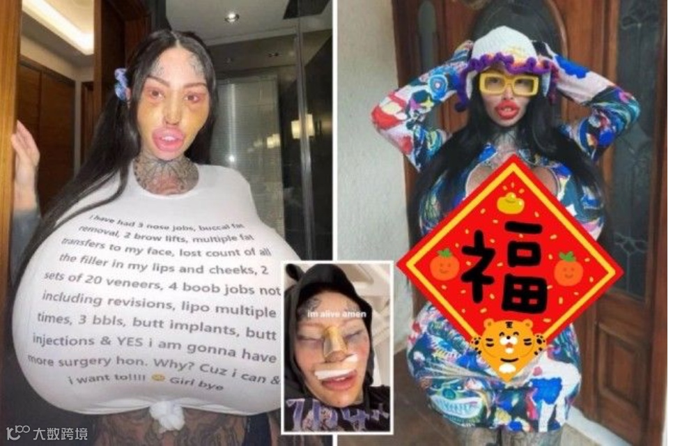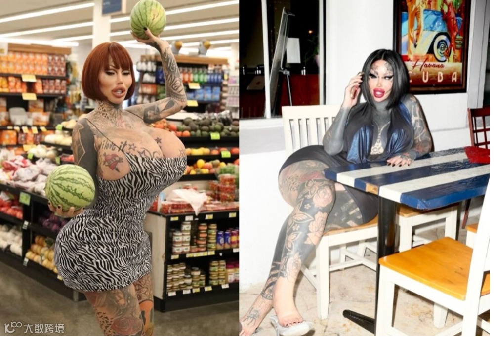 今年4月,她在社交平台坦言:“时间、金钱、健康,全都被掏空。我困在了无止境的修补地狱。”尽管曾计划取出假体、溶解填充物,试图重启生活,不久后仍继续进行全身黑纹身等极端改造。