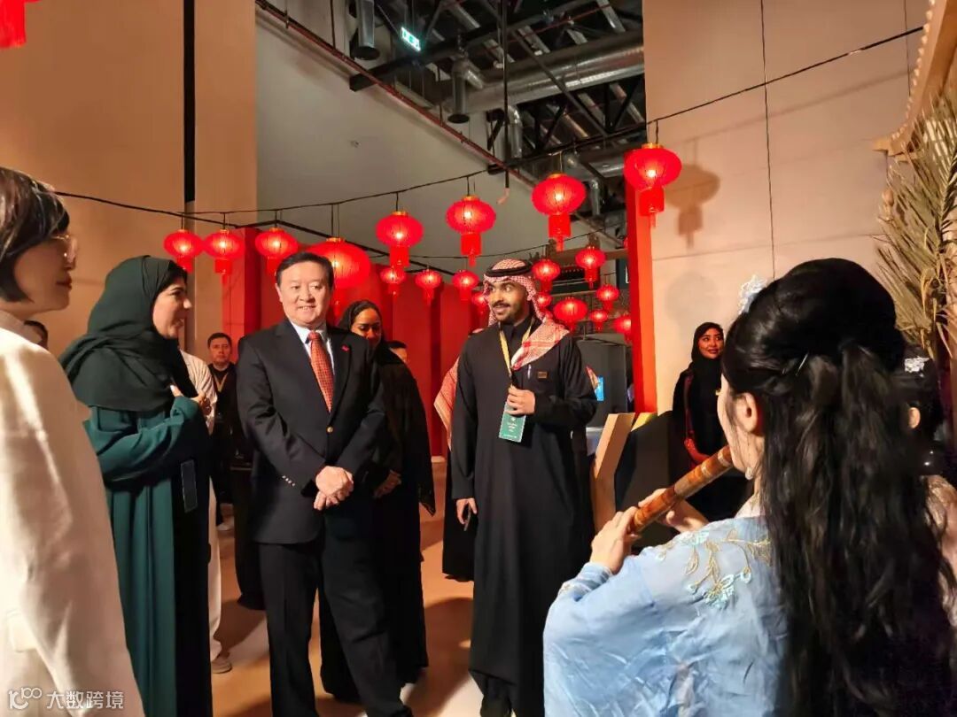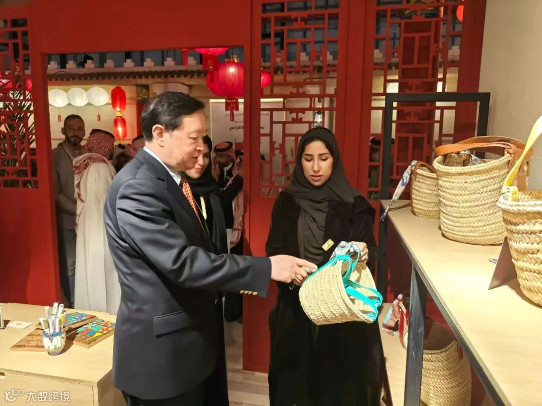 12月25日,中国驻沙特大使常华与沙特文化部次大臣拉希德共同参观市集,深入各展区观摩特色展演,与中沙艺术家亲切交流,同现场民众一道感受两国文化交流的蓬勃活力。