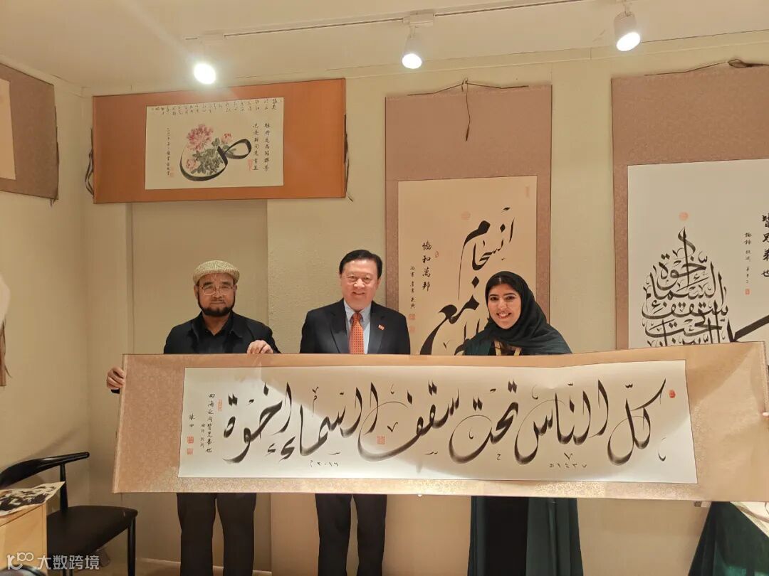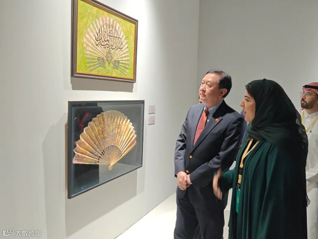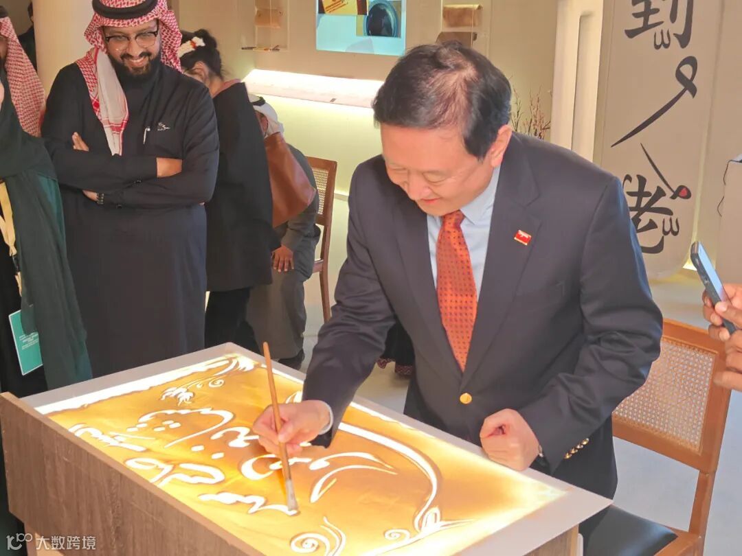 中阿书法展区墨香四溢,两国书法家现场挥毫,汉字与阿拉伯文交相辉映。常大使向拉希德介绍中华书法艺术,并与沙特艺术家共同书写阿拉伯文书法,展现文明对话的独特魅力。