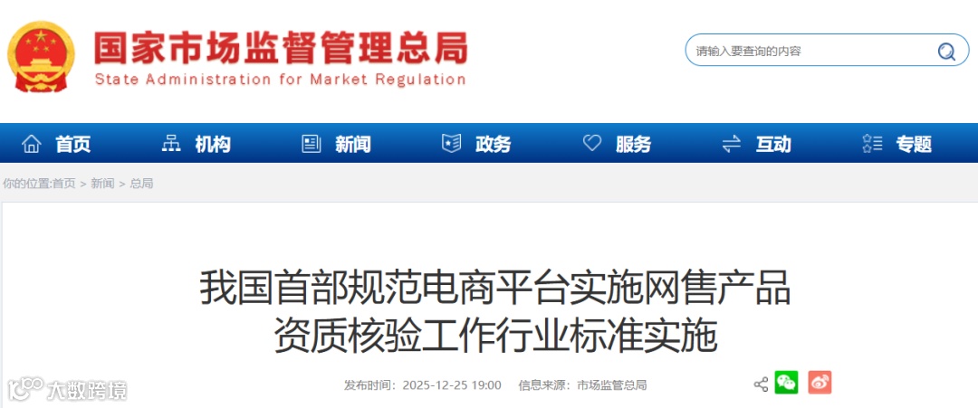 2025年12月,市场监管总局发布行业标准《强制性产品认证电商平台联网核查技术应用规范》。这是我国首部专门规范电商平台对网售产品进行强制性产品认证核查的行业标准。