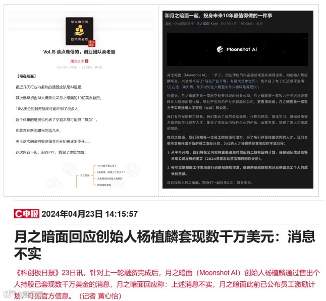 (月之暗面出卖老股的博客、官方宣布期权激励、以及官方回应,图源:小宇宙、月之暗面官方微信公众号、财联社)