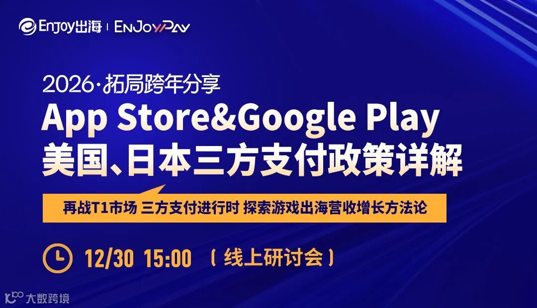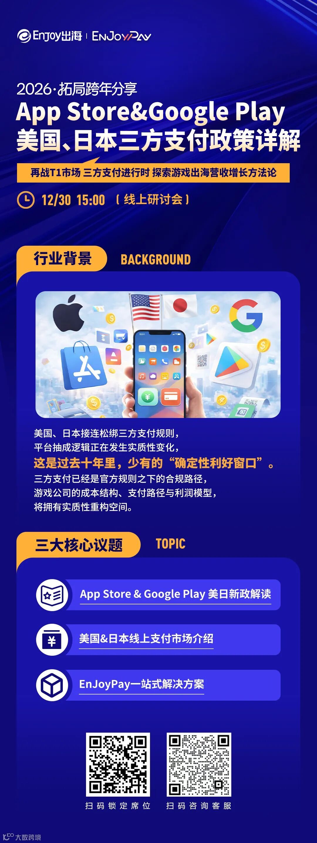 在这一关键节点,Enjoy出海&EnJoyPay发起「2026 · 拓局跨年分享」系列——App Store&Google Play美国、日本三方支付政策详解。本场分享将围绕美区、日区最新平台政策解读、当地线上支付市场结构,以及EnJoyPay一站式解决方案展开,帮助游戏出海团队把握平台松绑后的真实机会,在新一轮全球竞争中抢占先机。