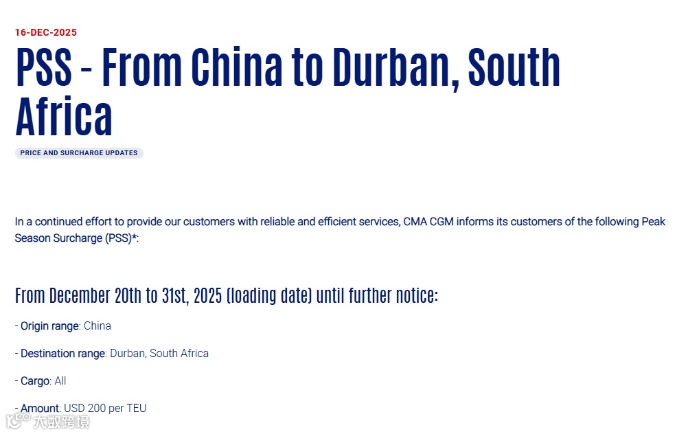 12月16日,达飞宣布,自2025年12月20日至31日(装货日期)起,直至另行通知,从中国至南非德班的全部货物征收旺季附加费(PSS),200 美元/TEU。