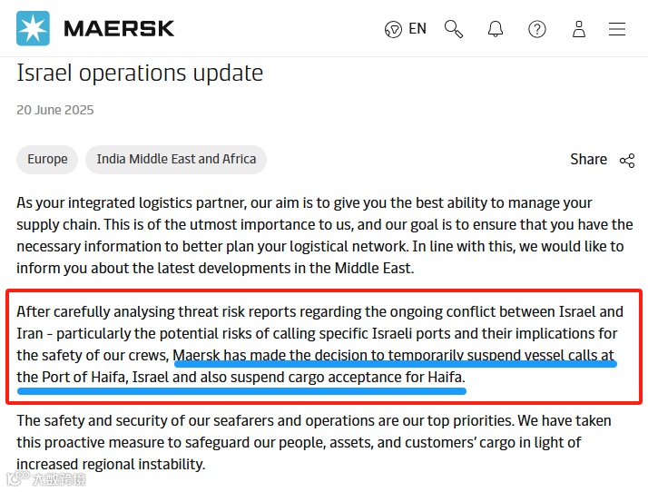 马士基在声明中表示,在仔细分析有关以色列和伊朗之间持续冲突的威胁风险报告,特别是停靠以色列港口的潜在风险及其对船员安全的影响后,决定暂停运营船舶停靠以色列海法港。
