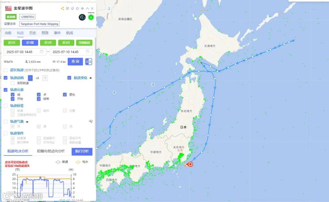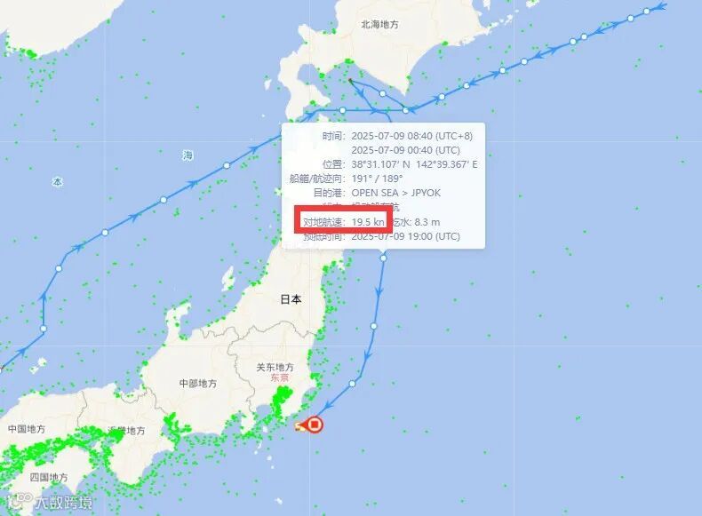 随后7月8日,该轮到达日本北海道南部海域停留了大约10个小时后南下,目前该轮已经抵达日本千叶县附近海域。