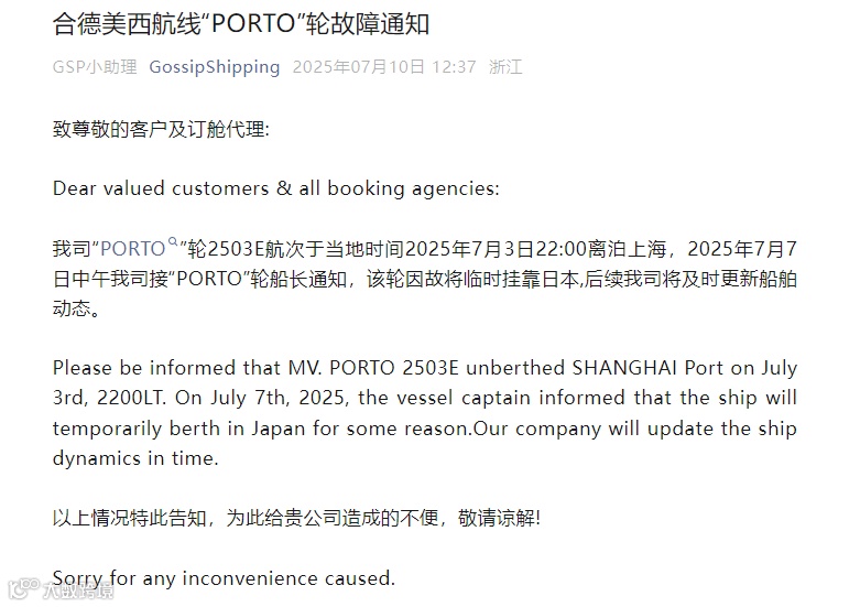 通知指出,该船于2025年7月3日晚上10点(当地时间)从上海港起航,但由于不可预见的原因,船长在2025年7月7日中午通知公司,“PORTO”轮将临时挂靠日本港口。