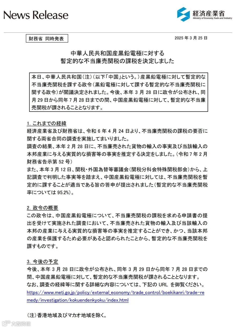 在收到日本石墨制造商SECCarbon、东海碳素和日本碳素公司要求征收关税的申请后,日本政府在2024年4月启动了调查。