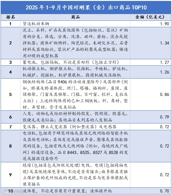 该类商品结构契合刚果(金)推进工业化、加强矿业开发与基础设施建设的实际需求。中资企业在当地参与矿产开发与工程建设,带动了中国相关机械、车辆与电力设备的出口,形成“以投资带动贸易”的良性循环。