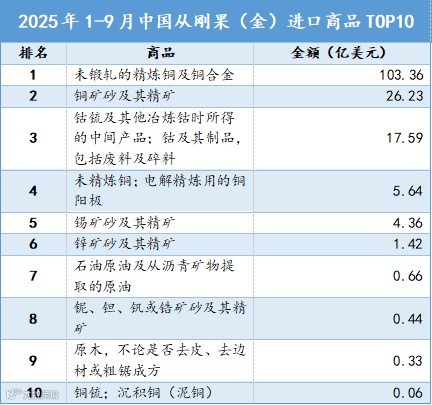 从进口商品结构看,矿产资源占据绝对主导地位。1-9月,中国自刚果(金)进口未锻轧的精炼铜及铜合金达103.36亿美元,占自刚进口总额的64.52%。加上铜矿砂及其精矿(26.23亿美元)、钴相关产品(17.59亿美元)等,矿产类商品合计占比超过90%。