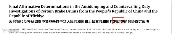 2025 年 6 月 16 日,美国商务部宣布其在反倾销和反补贴(AD/CVD)调查中,对某些来自中国和土耳其的制动鼓( Brake Drums)作出的最终肯定裁决。具体税率如下: