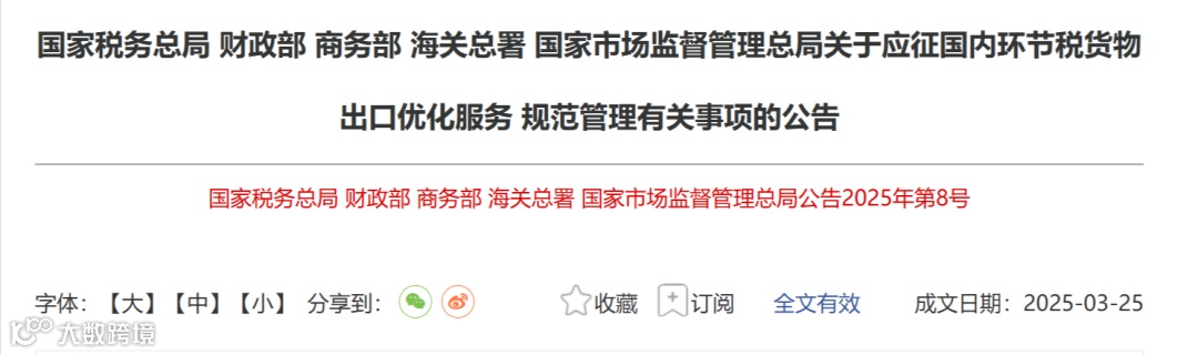 近日,国家税务总局、财政部、商务部、海关总署、国家市场监督管理总局联合发布公告,明确对应征国内环节税货物(如取消退税的货物、骗税企业出口货物等)的出口管理要求,严厉打击“买单出口”等违规行为。