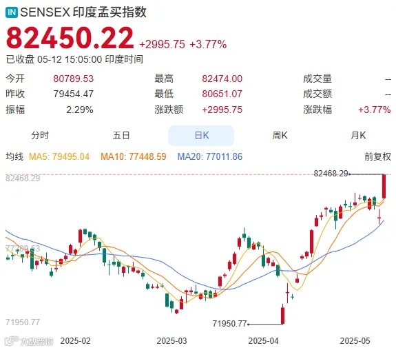 截至收盘,印度Sensex指数上涨3.77%,创下近一年来最大单日涨幅。