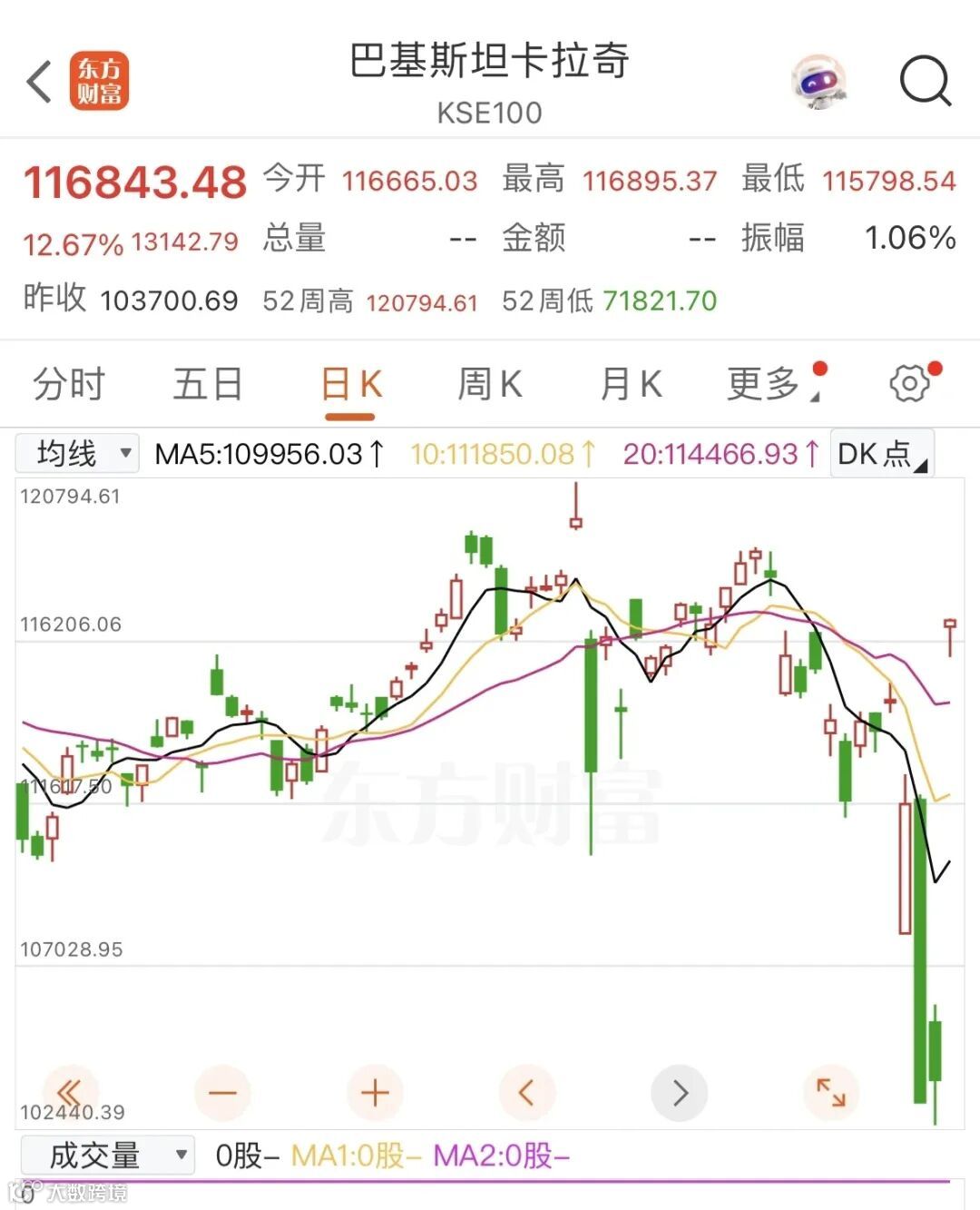 巴基斯坦基准股指KSE100指数飙升12%,触发熔断机制暂停交易。截至发稿前,该指数单日涨幅达12.67%。