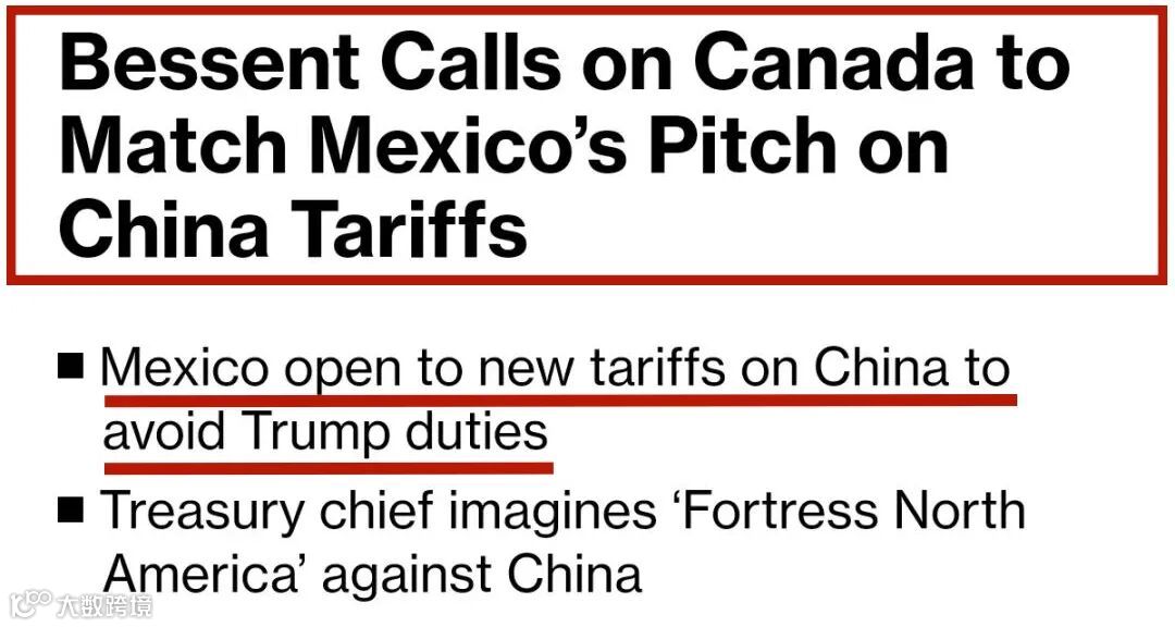 在本周的会谈前,斯科特·贝森特在华盛顿与墨西哥代表团的会议上已暗示墨西哥官员,主动对中国进口商品加征关税,可以作为避免特朗普威胁加征关税的策略之一。墨西哥官员对此表示赞同,并愿意提高对中国商品的关税,同时计划增加从美国的商品采购,以期避免特朗普总统威胁征收的25%关税。此举预示着墨西哥可能避免美国在3月4日对其加征25%的关税。