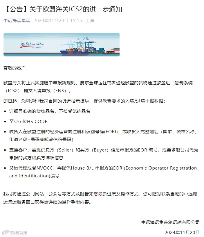 1、新版ENS申报需在起运前24小时提交货物详情。