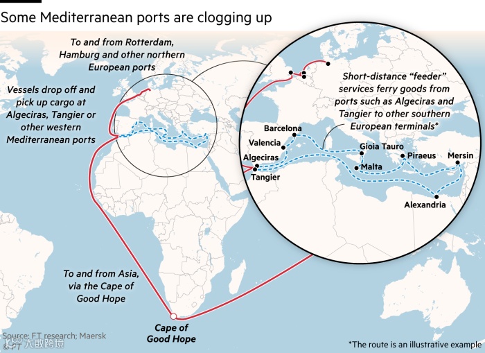 在胡塞武装发动袭击后,大多数在亚欧航线上运营的大型集装箱班轮公司都改变了航线,改道好望角,而不是经过苏伊士运河。因此班轮公司需要重新规划亚洲与地中海港口之间的货物运输路线。许多船舶绕过南非后,在地中海西侧的阿尔赫西拉斯和丹吉尔地中海等港口卸下集装箱,由支线船将货物运往南欧的其他码头。