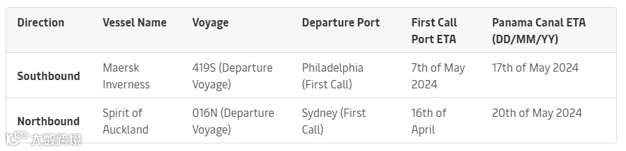 马士基的OC1航线计划于5月10日恢复其完整线路,即恢复通过巴拿马运河在美国东海岸和澳大利亚之间的航线航行。途经费城、查尔斯顿、巴拿马运河、巴尔博亚、陶朗加、悉尼、墨尔本、查尔默斯港、曼萨尼约、克里斯托瓦尔直至卡塔赫纳。