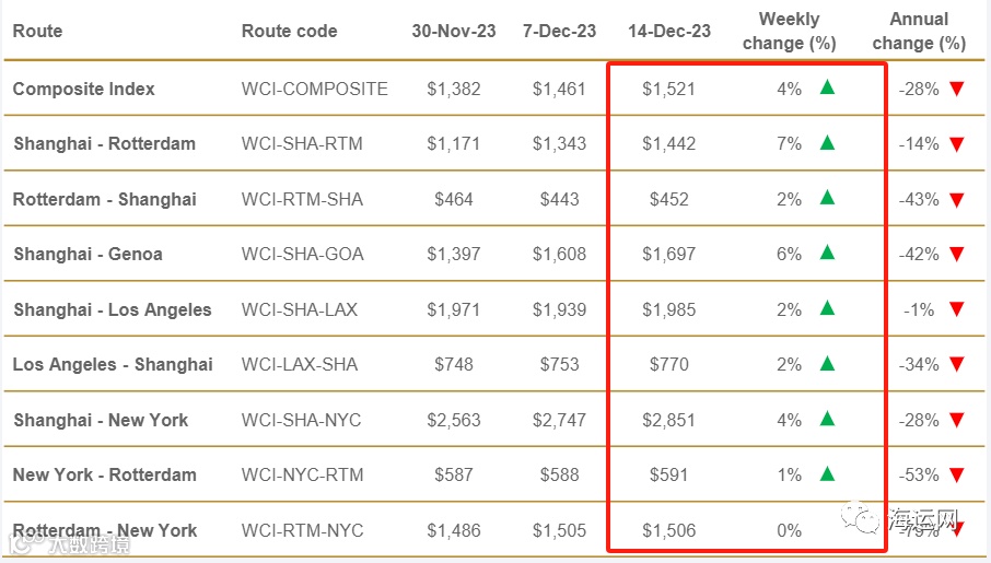 最新一期德路里世界集装箱综合指数上涨4%,所有航线全面上涨。上海至鹿特丹运费上涨7%即99美元至1442美元/FEU,;上海至热那亚的运费上涨6%即89美元1697美元/FEU。同样,上海至纽约的运价上涨了4%即104美元,达到2851美元/FEU。上海至洛杉矶的运价上涨了2%即46美元,达到1985美元/FEU。