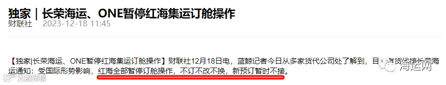 18日,澎湃新闻记者从货代方面独家获悉,受国际形势影响,中远海运、东方海外以及长荣海运已经口头通知暂停红海航线货物的接载。海洋网联船务ONE,目前也口头通知暂停红海航线的货物接载。