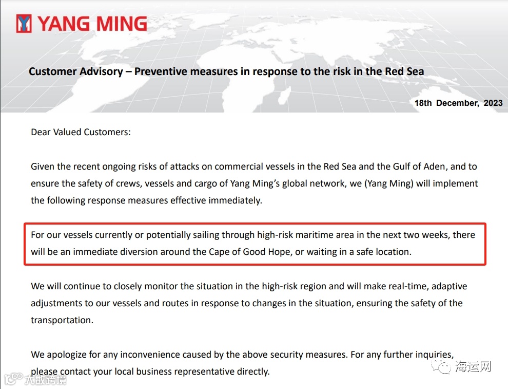 随着越来越多船公司避开苏伊士运河从红海转移到途经南非好望角,必将导致成本增加、运价上涨和船期延误。而目前不少船公司包括ONE也已提出欧地航线将大幅涨价,以星18日也发布更新通知,决定调升亚洲和印度到地中海和黑海的FAK费率,新一轮的运价的上涨不可避免。如果出现大面积的停航、绕航,这将对全球供应链受到打击。