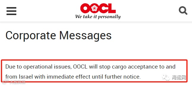 截止目前,可以确定的是长荣海运和东方海外OOCL官网已发布通知,暂停接收以色列进出口货物。