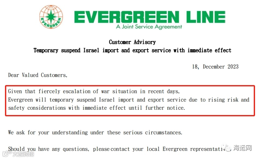 同时,东方海外官网发布通知,由于运营问题,将立即停止接收往返以色列的货物,直至另行通知。