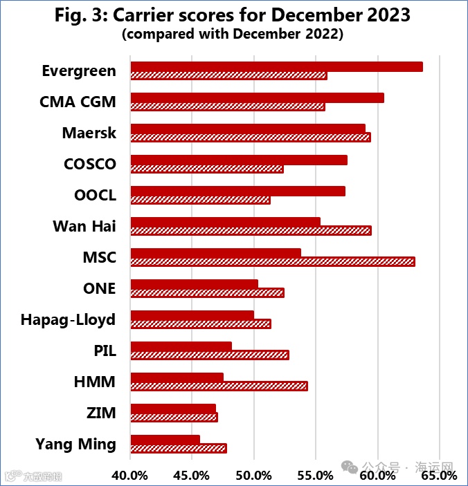 》,该报告详细列出了截至2023年12月的班轮可靠性数据,包括34条不同贸易航线的具体情况和60多家航运公司的班轮可靠性数据。这份报告为货主和货代更好地了解班轮运输的可靠性,从而更好地规划和管理运输需求具有一定指导意义。