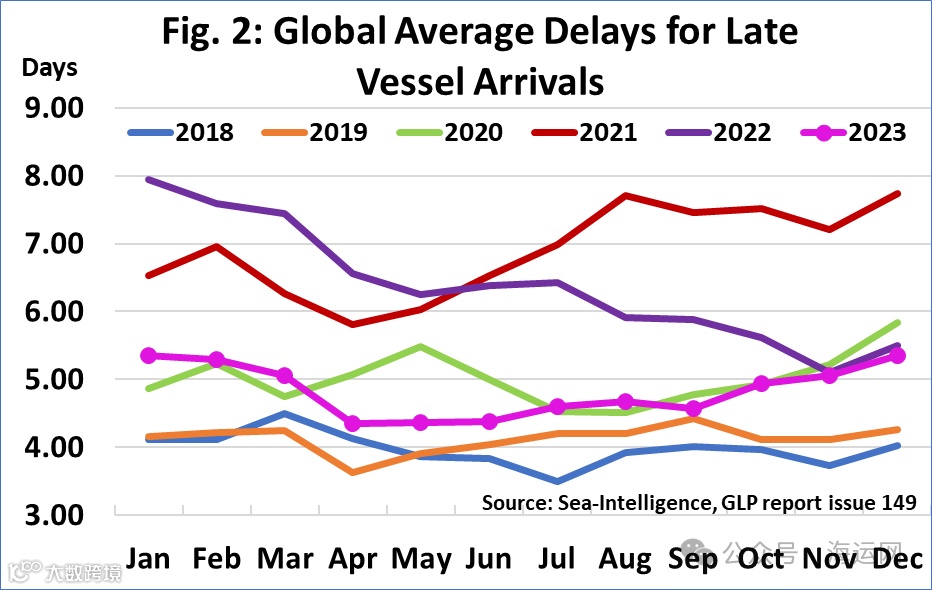 报告指出,2023年12月全球班轮准班率环比下降5.0%,这是自2021年2月以来的最大降幅达到56.8%。这一变化使得2023年12月成为近一年来可靠性第二低的月份。与去年同期相比,2023年12月的班轮准班率仅略高于2022年12月的0.4%。由于环非洲航行的影响,船只到达的平均延误