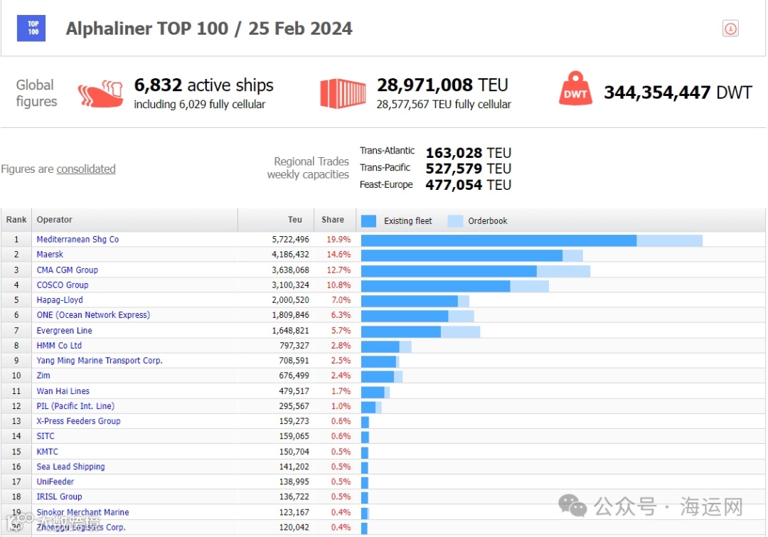 根据Alphaliner最新公布的数据,截止2月25日,全球在运营集装箱船数量共计6832艘,总运力为2897.1万TEU,折合约3.44亿载重吨。其中,前三大班轮公司总运力占全球市场的47.2%。