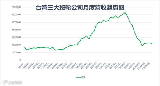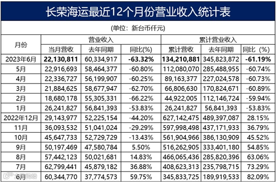 长荣海运2023年上半年累计实现营业收入新台币1342.1亿元(约43.9亿美元),同比下跌61.2%。