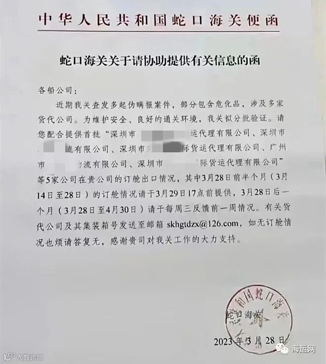 为进一步加大对危化品伪报瞒报的打击力度,3月28日,深圳蛇口海关向各大船公司发出紧急协助函,深圳蛇口海关在这份名为《关于请协助提供有关信息的函》的通知中,近期查发多起伪报瞒报案件,部分包含危化品,案件涉及5家货代企业罕见地出现在海关通知中。这也是此次升级严打的原因!