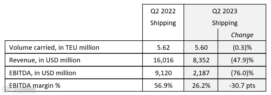 其中,航运业务实现营业收入84亿美元,同比下降48%;EBITDA为22亿美元,同比下降76%。平均运费为1491美元/TEU,同比下降10%。