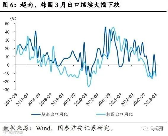 国泰君安宏观也指出,韩国和越南3月出口继续大幅下跌,反映外需仍在持续走弱中,其中韩国出口下跌13.6%,越南出口下跌13.2%,与中国出口明显背离,也在一定程度上说明中国3月出口可能更多地是因为订单回补等内部因素导致。