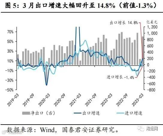 国泰君安宏观分析,虽然4月存在低基数大概率使得出口数据依然好看,但出口超预期并不具有持续性。原因在于疫情缓解后,积压的一部分订单转移至2023年一季度,使得1-2月出口略超季节性,同时春节因素可能在一定程度上延长了订单回补时间,使得3月份出口大超预期。