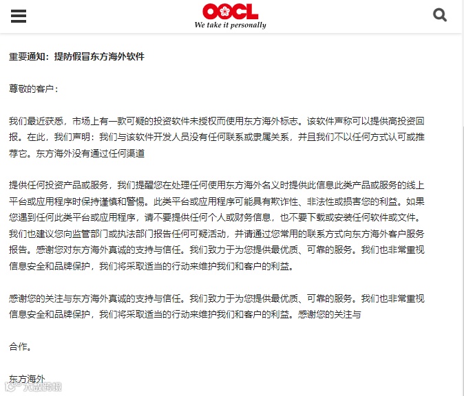 东方海外强调,其十分重视信息安全和品牌保护,将采取适当的行动来维护自身和客户的利益。