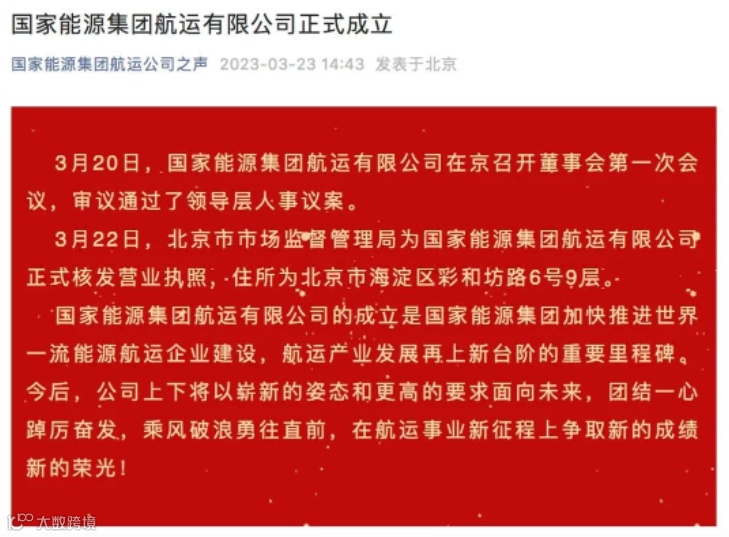3月22日,北京市市场监督管理局为国家能源集团航运有限公司正式核发营业执照。
