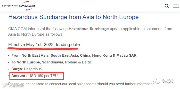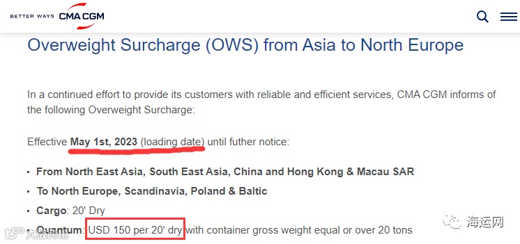 GES Shenzhen日前,达飞官网发布告客户通知书称,为了继续努力为客户提供可靠和高效的服务,达飞通知自2023年5月1日(装船日)生效,征收以下超重附加费,直至另行通知。