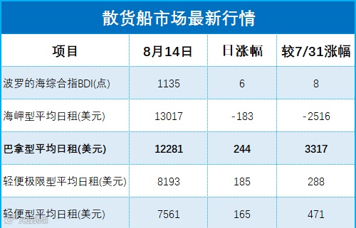 日租金再涨逾2%至12281美元,自7月下旬起累计涨幅逾52%,散货船东出租一艘赚一艘。