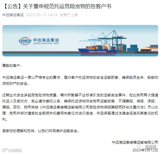 日前,中远海运集运再次发布《关于重申规范托运危险货物的告客户书》,告知书称,近期业内发生多起因危险货物质量、箱内积载等不达标准引发的运输安全事件,在此再次提请托运人及受托方,务必遵守委托义务,确保托运货物符合我司运输政策,不得瞒报、谎报、误报、漏报。否则,将按《中远海运集装箱运输有限公司危险货物谎报瞒报预防与处置办法》予以处理,并将对遭受的全部损失和费用向责任方进行追偿,并且保留通过法律途径追究其责任的权利。