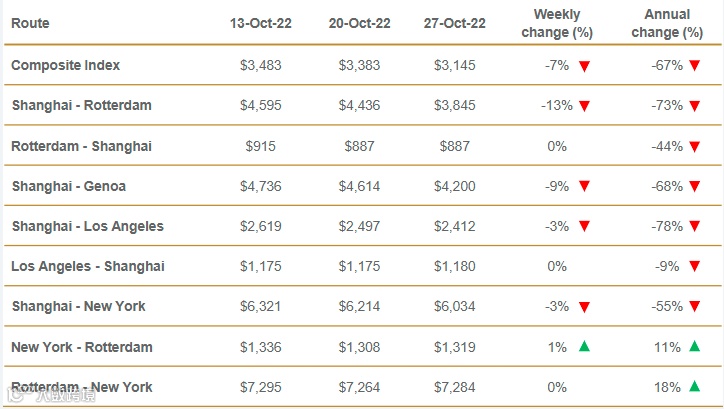 不过,本期下滑7%是10月最大的一次跌幅。各大主要航线继续全面下跌,上海-鹿特丹的北欧航线运价大幅下滑13%,而上海-洛杉矶运价进一步下滑较2021年9月峰值已下降了81%以上。
