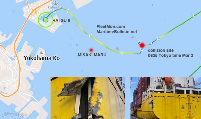 宝船网船舶AIS信息显示,“海速6”轮已于3月2日7点11分抵达日本横滨港,“MISAKI MARU”轮则在碰撞地点附近抛锚。