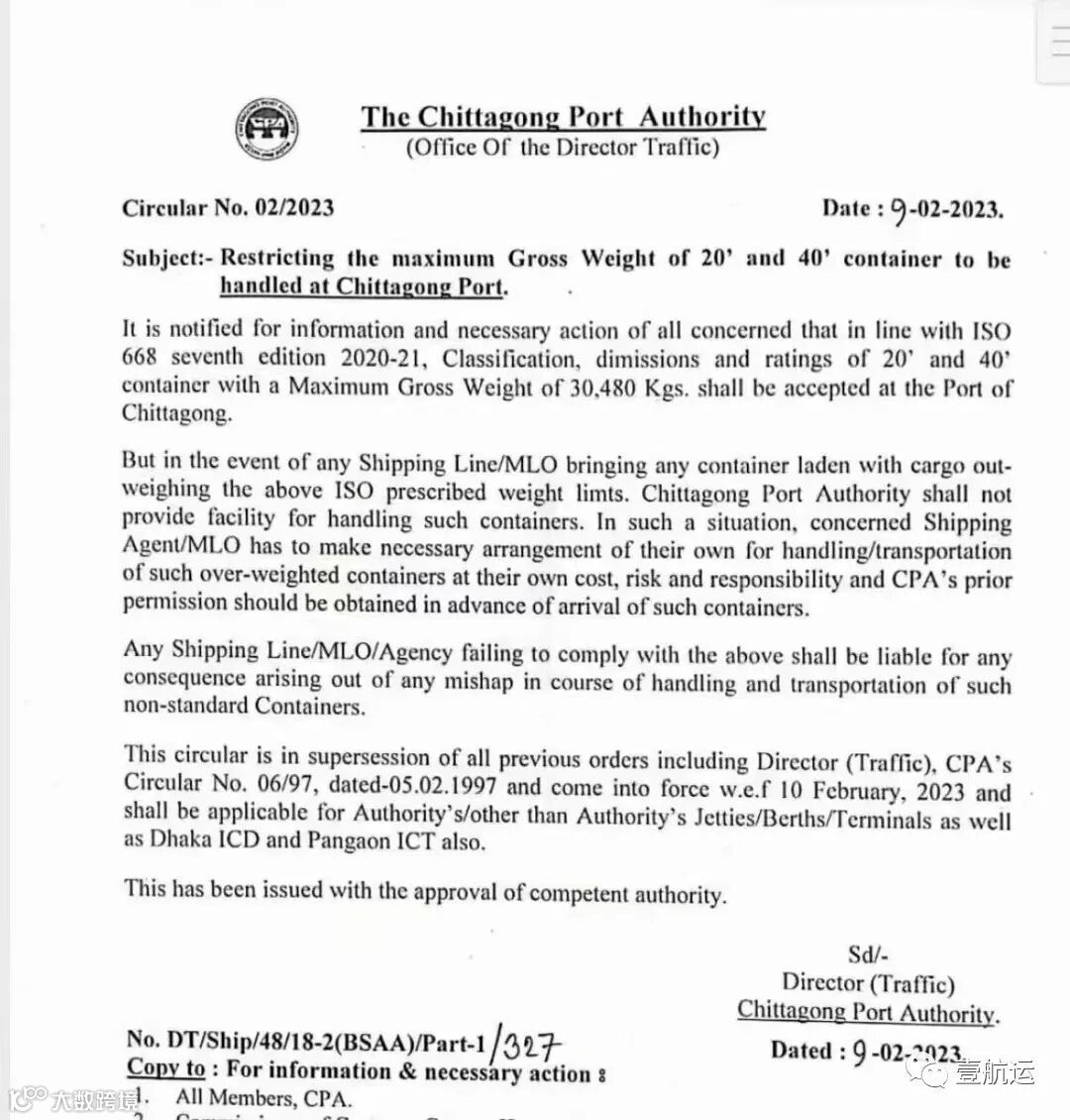 最新获悉:近期,孟加拉最大集装箱港口吉大港(Chittagong Port)出台了一则新的箱子重量限制规范--从2月10日起,在吉大港(Chittagong Port)装卸的集装箱,无论是20尺柜,还是40尺柜,最大毛重(Gross Weight)不得超过30.48吨!