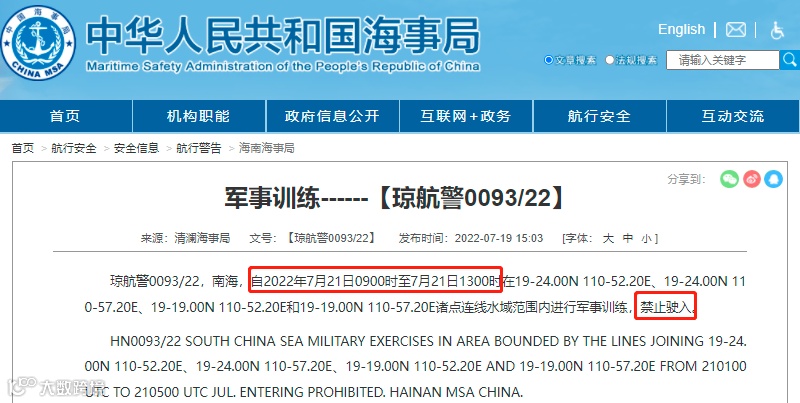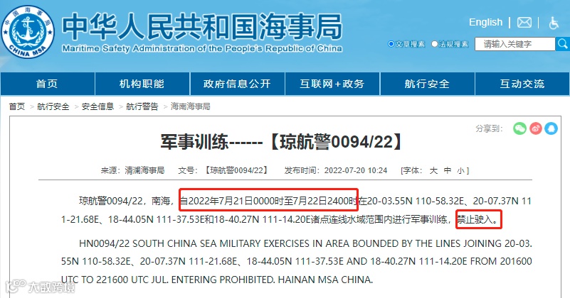 据清澜海事局消息,琼航警0094/22 南海 自2022年7月21日0000时至7月22日2400时在