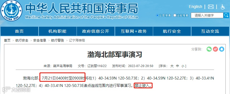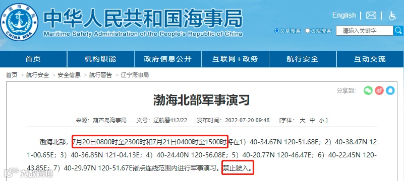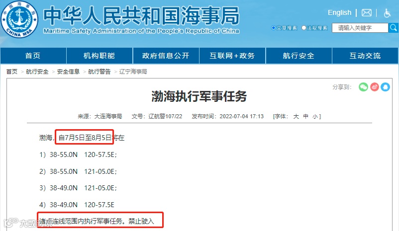 据大连海事局消息:辽航警107/22 渤海, 自7月5日至8月5日将在: